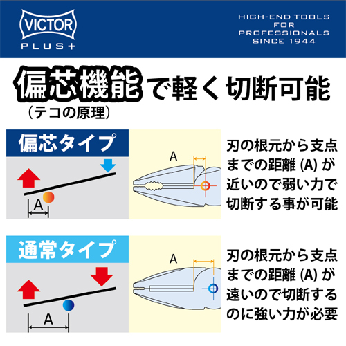 ・一日に何回も切断作業をおこなう。硬い線材を切る事が多い。そんな人達の負担を少しでも軽減させる為に偏芯機能を採用しました。